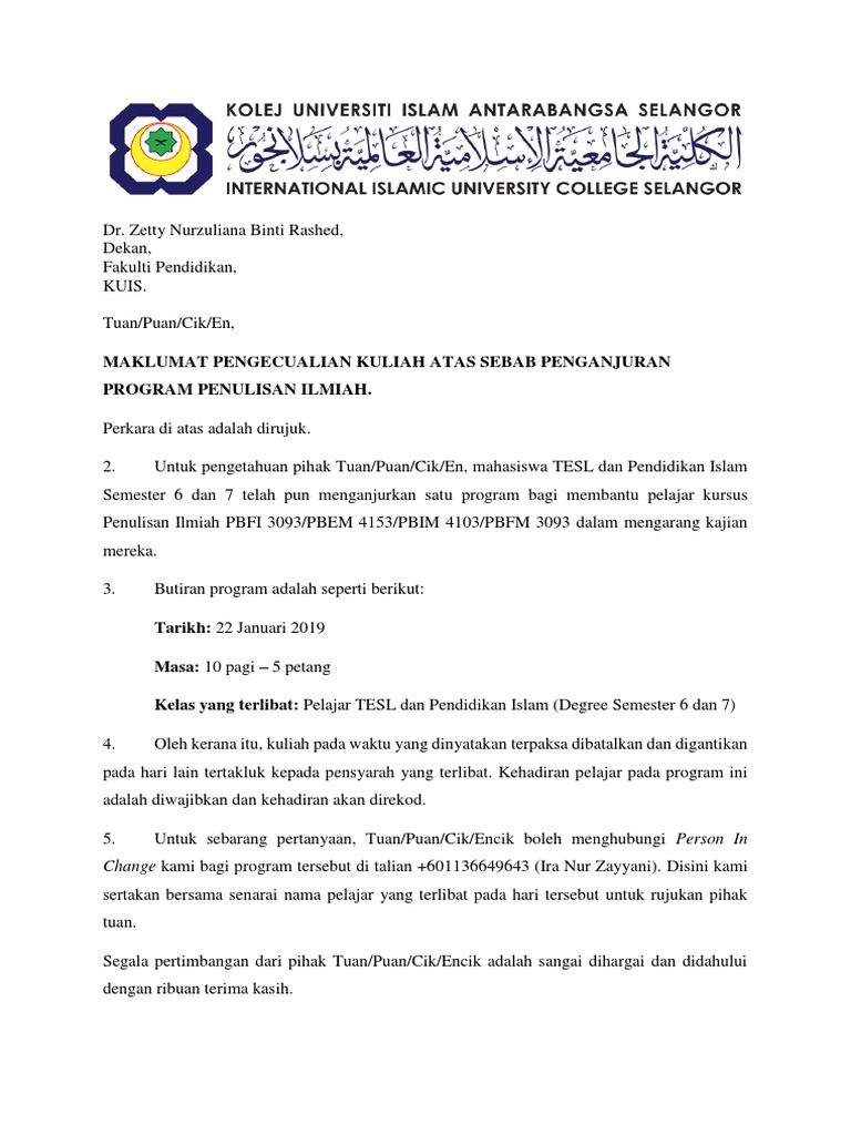 Surat Permohonan Pengecualian Kuliah Pengarah Pdf