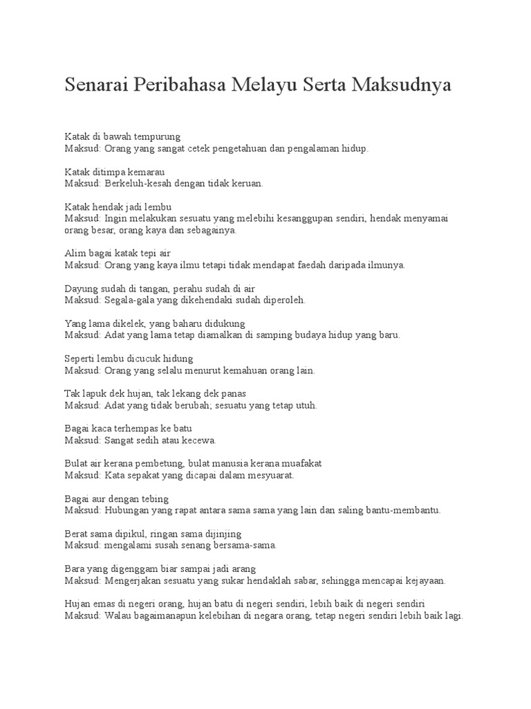 23072021 senarai simpulan bahasa dan maksud peribahasa melayu yang terdapat dalam buku teks sekolah rendah dan menengah beserta maksud di bawah adalah sebagai panduan dan rujukan pelajarpenggunaan peri bahasa dalam penulisan karangan. Jul 23 2021 ipendidikan tips koleksi peribahasa dan simpulan bahasa serta maksud disemak dan dikemaskini pada pukul 1016 pm 23 julai 2021 senarai simpulan bahasa dan maksud peribahasa melayu yang terdapat dalam buku teks sekolah rendah dan menengah beserta maksud di bawah adalah sebagai panduan dan rujukan pelajar. Kali ini kami ingin kongsikan 20 peribahasa dan maksud lengkap dengan penerangan serta contoh.